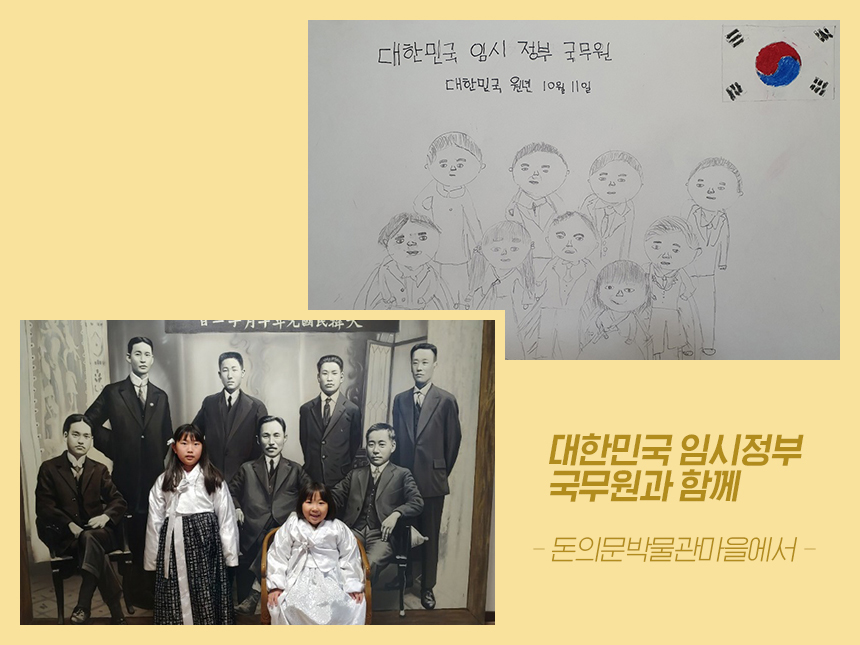 “아이들 손을 잡고 흘러간 근현대사의 기억을 고스란히 품고 있는 돈의문박물관마을을 찾았습니다. 그곳에서 자랑스러운 대한민국 임시정부 국무원의 사진을 보았습니다. 아이들은 한복을 입고 그들과 함께 사진을 찍고 그 뜻을 다시 한번 기리기 위해 집으로 돌아와 태극기를 그려보는 시간을 가졌습니다.”