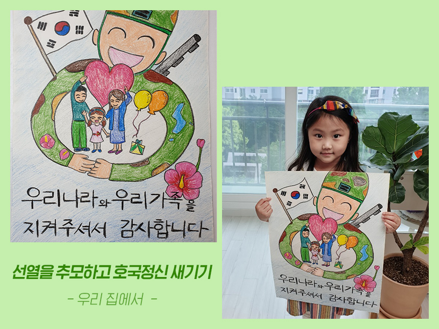 “나라를 지켜주신 호국선열들에 대한 감사의 마음을 그림을 통해 전합니다. 올해는 코로나19로 인해 현충 시설 방문을 자제하였지만, 생활 속 거리 두기를 실천하면서 우리 가족, 우리나라의 건강을 지키고자 합니다. 하루빨리 건강한 대한민국이 되었으면 좋겠습니다!”