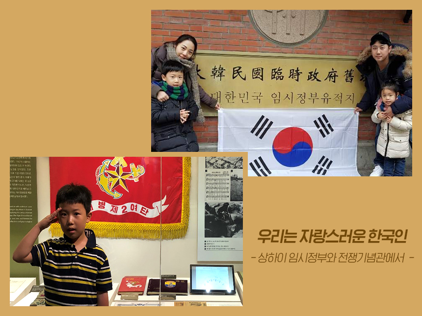 “아이들이 중국 주재원으로 근무했던 저를 따라 중국에서 자란 탓인지 스스로 중국인이라고 말하는 모습에 충격을 받았습니다. 그 후 지속해서 아이들에게 한국의 역사를 가르쳤습니다. 요즘은 직업군인으로 복무하셨던 할아버지로부터 애국 교육을 열심히 받고 있습니다. 아이들이 자랑스러운 한국인으로 자라주기를 바랍니다.”