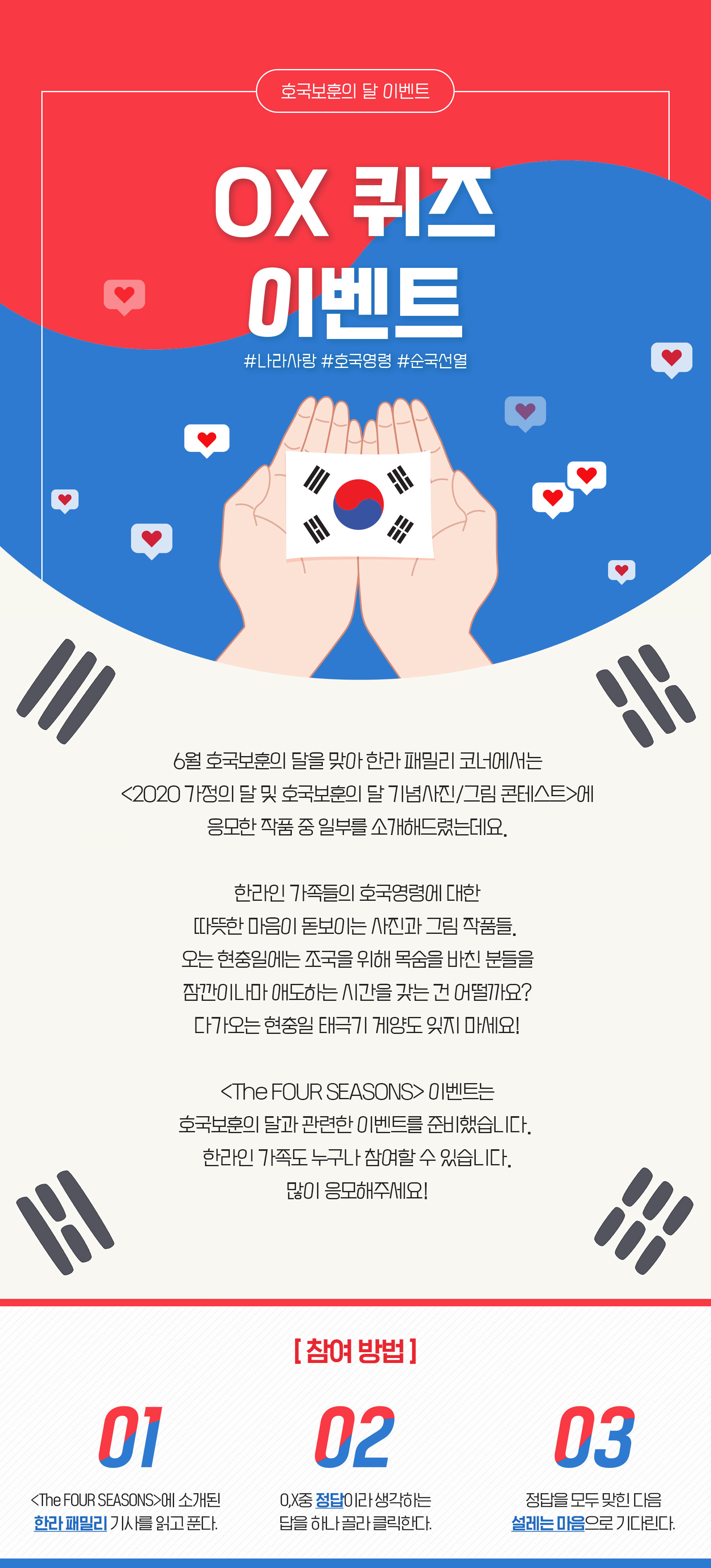 국가보훈처는 6월을 위해 숭고한 희생을 보여주신 분들을 기리고 애국정신을 함양하기 위해 호국보훈의 달로 지정했다. 6월 1일~10일은 추모의 기간, 11일~20일은 감사의 기간, 21~30일은 화합과 단결의 기간으로 나눠 다양한 호국ㆍ보훈행사를 진행하고 있다.