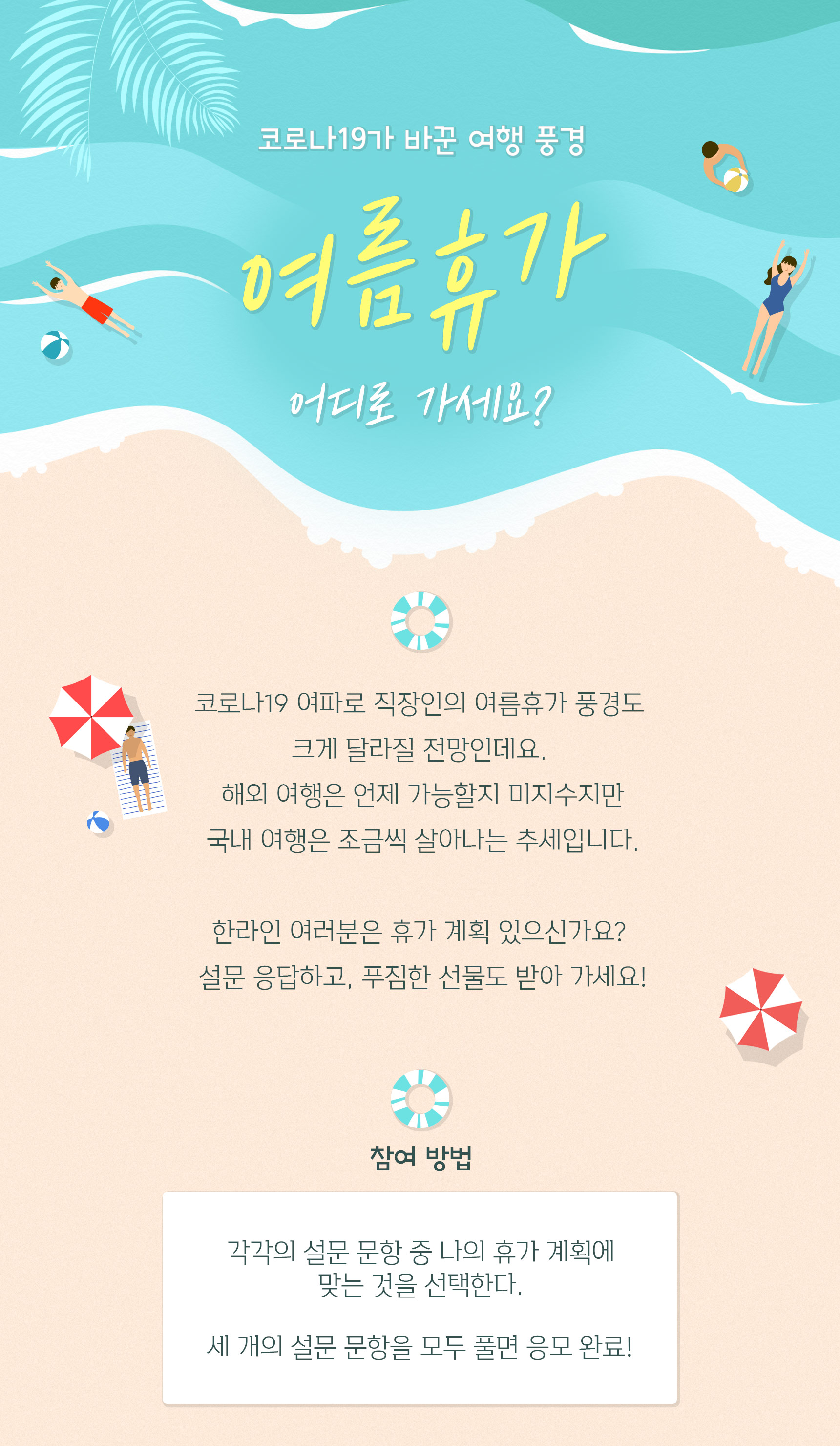 여름 휴가 계획 있으세요?설문조사 이벤트! Q1. 올 여름 휴가 계획 있으신가요? 1. 있다 2. 없다 3. 아직 미정 다음 Q2. 지금 휴가를 떠날 수 있다면 어디로? 1. 호캉스(호텔+바캉스) 2. 가까운 국내로 짧은 여행 3. 자연을 찾아서 4. 집에서 휴식하기 5. 기타 다음 Q3. 코로나19 종식 이후 가장 떠나고 싶은 해외여행지는? 1. 동남아 2. 유럽 3. 미국, 캐나다 4. 호주, 뉴질랜드 5. 기타 다음 수고하셨습니다. 틀린 답이 있네요.정답을 모두 맞춰야 이벤트 응모가 가능합니다.다시 한번 풀어보세요. 이름 전자우편 휴대전화 응모하기 개인정보 수집에 동의합니다. 개인정보는 이벤트 당첨자 확인 및 배송 정보 등으로만 사용되며 본 이벤트 외에 다른 용도로 사용되지 않습니다. [이벤트 서비스를 위한 개인정보 수집 및 이용] 서비스 제공을 위하여 이용자의 개인정보를 아래와 같이 수집하고 있습니다. 고객의 정보는 이벤트 서비스에 참여하기 위한 필수정보로서 제공을 원하지 않을 경우 수집하지 않으며, 동의 거부 시 이벤트 참여에 제한을 받을 수 있습니다. 1. 수집 · 이용 목적 - 이벤트 혜택을 제공하기 위한 정보 전달 - 이벤트 혜택 이용에 따른 본인확인, 고지사항 전달 - 접속 빈도 파악 또는 회원의 서비스 이용에 대한 통계 2. 수집 필수 항목 - 이름, 연락처, 이메일 3. 개인정보 보유 및 이용기간 - 이벤트 종료 후 1년까지 (단, 관계 법령에 따라 필요한 경우 해당 법률에서 정한 기간까지) 4. 이용 제한 대상 - 만 14세 미만은 법적 보호자의 동의가 필요합니다. ※ 고객님께서 개인정보의 수집/이용에 동의하지 않을 권리가 있으며, 미동의 시 서비스를 이용하실 수 없습니다. 다시하기 × 공감8 등록된 댓글이 없습니다. 댓글 등록 Cancel reply 이름은 전체공개되며, 닉네임으로 설정 가능합니다. 이메일은 공개되지 않습니다. 이미지 업로드는 10 MB까지 가능합니다.