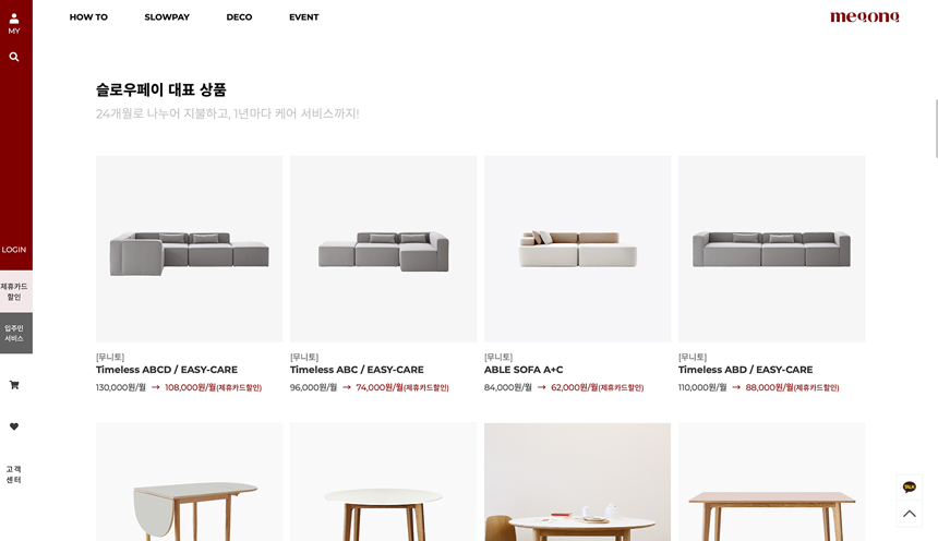 A. 할부는 단순히 금액을 쪼개서 내는 것이죠. 할부 폭이 24개월까지 가지도 않고요. 가구 구독은 구매가 아닌 구독이기 때문에 2년 주기로 교체가 가능합니다. 또 회수 옵션을 신청하면 다음 집으로 옮길 때 이삿날 회수 서비스도 함께 하죠. 전문가의 정기점검 서비스도 구독의 장점입니다. 파손 등의 큰 수리는 유상이지만 대부분 무상 수리가 가능합니다. 클리닝과 화이트닝 서비스도 받을 수 있고요. 구독하는 내내 깨끗하게 사용할 수 있죠. 얼마 전부터는 카드사 제휴를 통해 월 부담금을 줄이고 있습니다. 현재 롯데카드사와 제휴를 맺었고 앞으로 다른 카드사와도 협력할 예정입니다. 궁극적으로 구독과 할부의 다른 점은 소유와 경험에 있습니다. 할부가 리스크를 안고 하나를 소유하는 것이라면 구독은 체험하고 경험해 보는 것이죠.