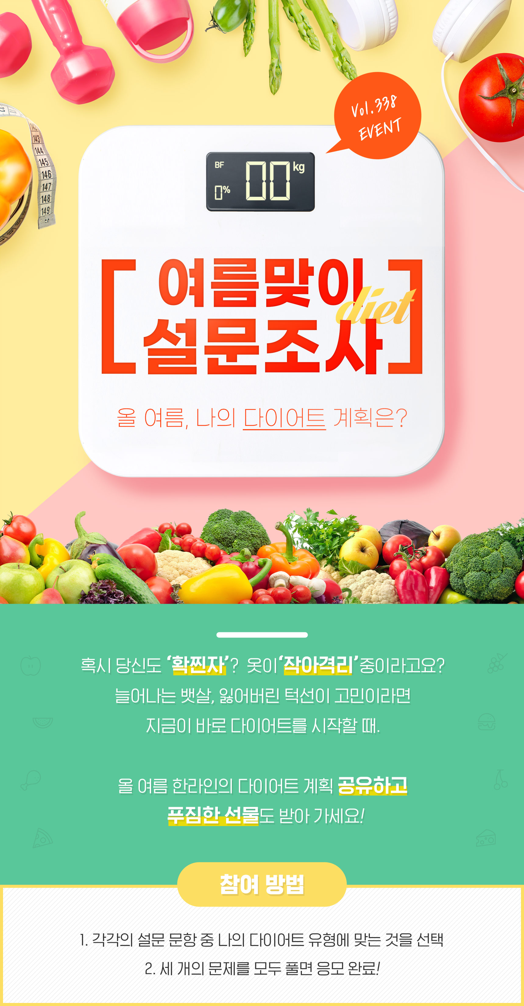 올 여름, 나의 다이어트 계획은?설문조사 이벤트! 1. 올 여름, 다이어트를 계획 중이다 YES NO 다음 2. 다음 중 가장 다이어트 의욕 생길 때는? 예전에 산 옷이 맞지 않을 때 몸매 좋은 사람을 볼 때 주변에서 살쪘다는 말을 들었을 때 다이어트에 성공한 비포&애프터를 볼 때 보정 없는 사진 속 내 모습을 볼 때 다음 내가 가장 선호하는 다이어트 방법은? 근력을 높여라, 헬스 다이어트의 9할은 먹기, 식이조절 돈 안 드는 맨몸 운동, 걷기나 뛰기 한여름에도 시원하게, 수영 운동도 집에서, 홈트 다음 참여완료 틀린 답이 있네요.정답을 모두 맞춰야 이벤트 응모가 가능합니다.다시 한번 풀어보세요. 이름 전자우편 휴대전화 응모하기 개인정보 수집에 동의합니다. 개인정보는 이벤트 당첨자 확인 및 배송 정보 등으로만 사용되며 본 이벤트 외에 다른 용도로 사용되지 않습니다. [이벤트 서비스를 위한 개인정보 수집 및 이용] 서비스 제공을 위하여 이용자의 개인정보를 아래와 같이 수집하고 있습니다. 고객의 정보는 이벤트 서비스에 참여하기 위한 필수정보로서 제공을 원하지 않을 경우 수집하지 않으며, 동의 거부 시 이벤트 참여에 제한을 받을 수 있습니다. 1. 수집 · 이용 목적 - 이벤트 혜택을 제공하기 위한 정보 전달 - 이벤트 혜택 이용에 따른 본인확인, 고지사항 전달 - 접속 빈도 파악 또는 회원의 서비스 이용에 대한 통계 2. 수집 필수 항목 - 이름, 연락처, 이메일 3. 개인정보 보유 및 이용기간 - 이벤트 종료 후 1년까지 (단, 관계 법령에 따라 필요한 경우 해당 법률에서 정한 기간까지) 4. 이용 제한 대상 - 만 14세 미만은 법적 보호자의 동의가 필요합니다. ※ 고객님께서 개인정보의 수집/이용에 동의하지 않을 권리가 있으며, 미동의 시 서비스를 이용하실 수 없습니다. 다시하기 × 공감6 등록된 댓글이 없습니다. 댓글 등록 Cancel reply 이름은 전체공개되며, 닉네임으로 설정 가능합니다. 이메일은 공개되지 않습니다. 이미지 업로드는 10 MB까지 가능합니다.