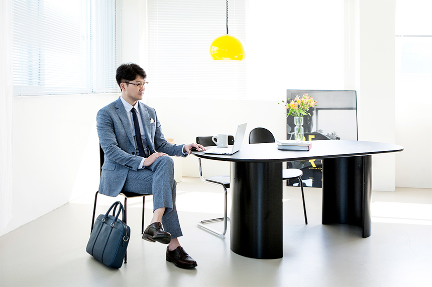 중요한 발표나 미팅이 있는 날은 클래식 슈트가 정답이다. 시어서커와 같은 시원한 소재로 만든 슈트도 다양하므로 부담 없이 시도해 보자. 재킷과 팬츠는 청량감이 느껴지는 블루 컬러로 통일하고 스트라이프 패턴의 드레스 셔츠를 매치하면 말쑥한 신사로 변신한다. 짙은 톤의 블루 넥타이는 전체 스타일의 무게 중심이 된다.