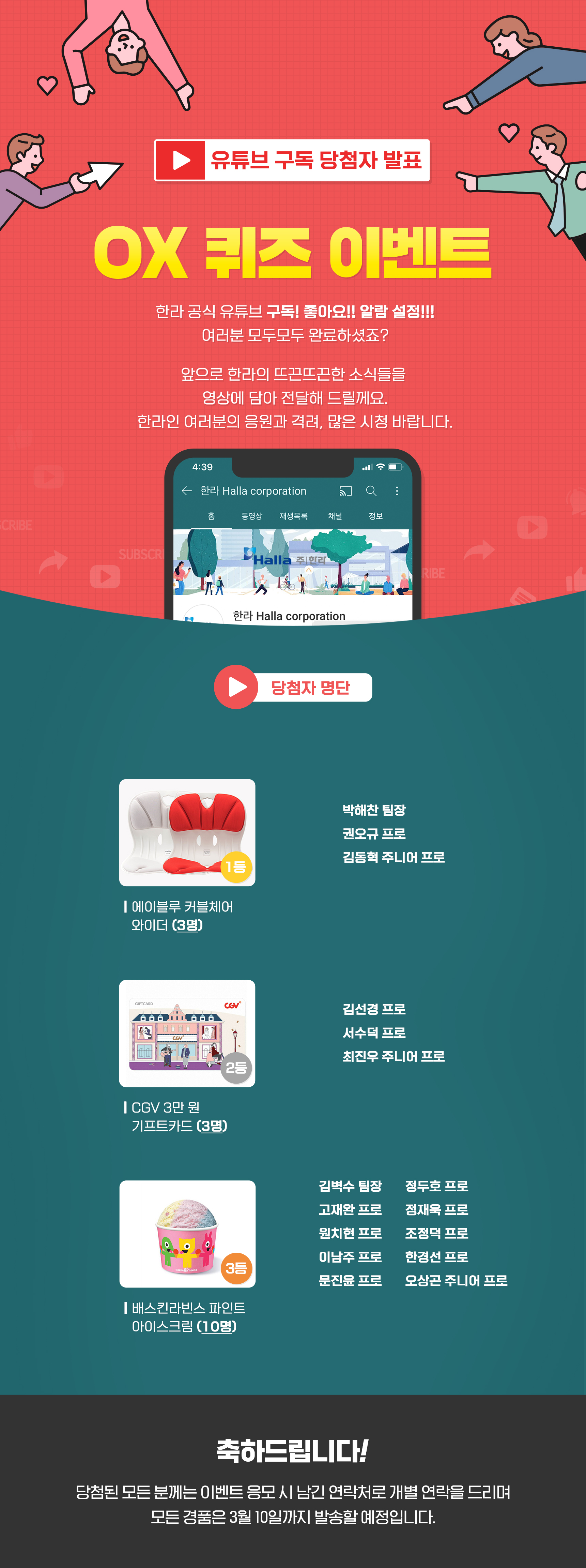 한라 공식 유튜브 구독하기OX 퀴즈 이벤트 당첨자 발표 공감1 등록된 댓글이 없습니다. 댓글 등록 Cancel reply 이름은 전체공개되며, 닉네임으로 설정 가능합니다. 이메일은 공개되지 않습니다. 이미지 업로드는 10 MB까지 가능합니다.