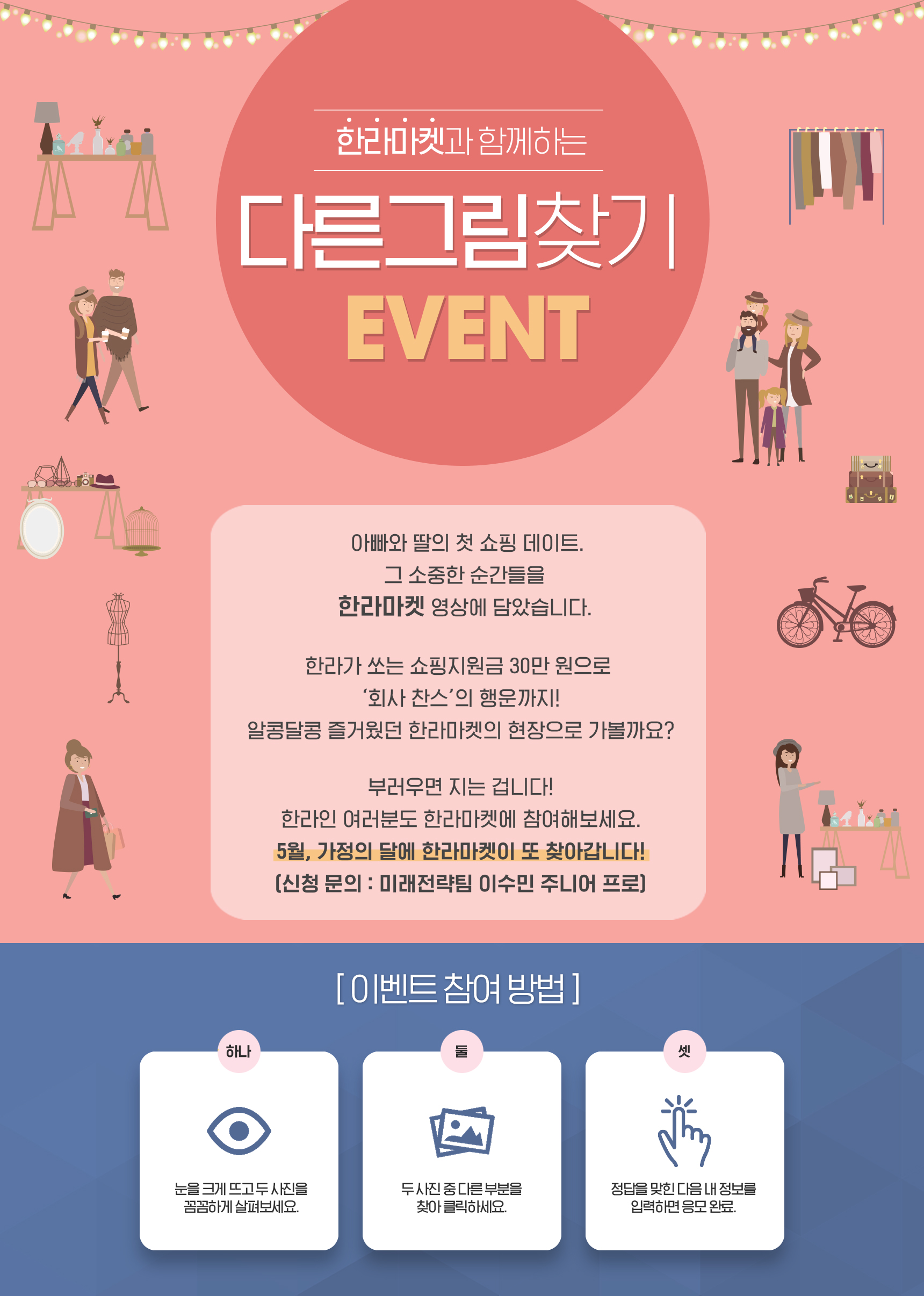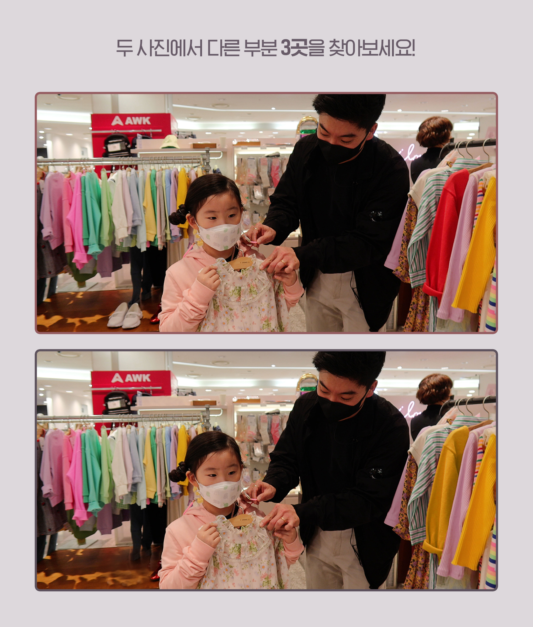 한라마켓과 함께하는다른 그림 찾기 이벤트 축하드립니다 정답입니다. 이름 전자우편 휴대전화 응모하기 개인정보 수집에 동의합니다. 개인정보는 이벤트 당첨자 확인 및 배송 정보 등으로만 사용되며 본 이벤트 외에 다른 용도로 사용되지 않습니다. [이벤트 서비스를 위한 개인정보 수집 및 이용] 서비스 제공을 위하여 이용자의 개인정보를 아래와 같이 수집하고 있습니다. 고객의 정보는 이벤트 서비스에 참여하기 위한 필수정보로서 제공을 원하지 않을 경우 수집하지 않으며, 동의 거부 시 이벤트 참여에 제한을 받을 수 있습니다. 1. 수집 · 이용 목적 - 이벤트 혜택을 제공하기 위한 정보 전달 - 이벤트 혜택 이용에 따른 본인확인, 고지사항 전달 - 접속 빈도 파악 또는 회원의 서비스 이용에 대한 통계 2. 수집 필수 항목 - 이름, 연락처, 이메일 3. 개인정보 보유 및 이용기간 - 이벤트 종료 후 1년까지 (단, 관계 법령에 따라 필요한 경우 해당 법률에서 정한 기간까지) 4. 이용 제한 대상 - 만 14세 미만은 법적 보호자의 동의가 필요합니다. ※ 고객님께서 개인정보의 수집/이용에 동의하지 않을 권리가 있으며, 미동의 시 서비스를 이용하실 수 없습니다. 공감4 5 Comments … 다른 그림 찾기 공주님께서 예쁜 드레스를 골랐네요~~ 부럽부럽 찾았네. 현대아울렛이댱!! 댓글 등록 Cancel reply 이름은 전체공개되며, 닉네임으로 설정 가능합니다. 이메일은 공개되지 않습니다. 이미지 업로드는 10 MB까지 가능합니다.