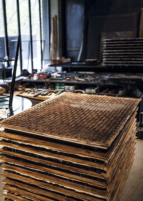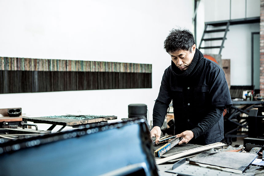 허명욱 작가는 철판과 나무로 틀을 잡고 옻칠로 색을 올리고 또 올리는 작업을 두고 시간을 쌓는다고 했다. 옻칠화 작품 하나가 완성되기까지 수개월, 아니 수년이 걸린다. 그 안에는 얼마나 많은 감정과 사연이 서릴까. 작가 허명욱은 15년 전 경기도 용인 산 중턱에 작업실을 지었다. 작품 활동이 활발해지면서 공간은 점차 늘어났고, 공간이 늘면서 작품 세계도 확장하고 있다. 허명욱 작가를 만나 그의 공간과 작품 세계에 관해 물었다.