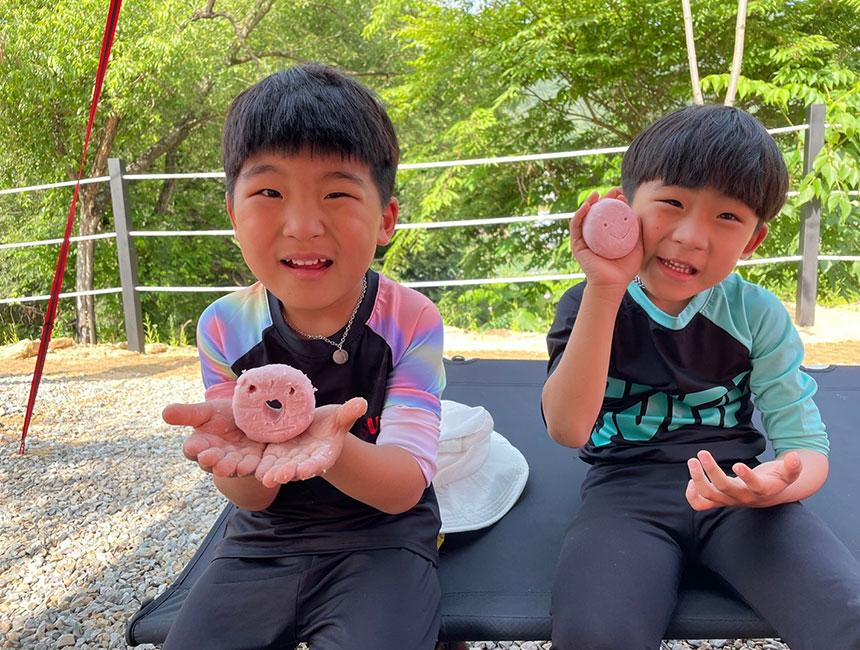 주말에 캠핑장에서 두 아들 도윤, 도준이와 비누 만들기를 체험했어요. 각각의 재료를 잘 섞어서 반죽하고, 아이들이 각자 만들고 싶은 대로 도너츠 비누와 스마일 비누를 만들어 보았습니다. 아이들도 쉽게 만들 수 있는 간단한 체험이라 좋았습니다.
