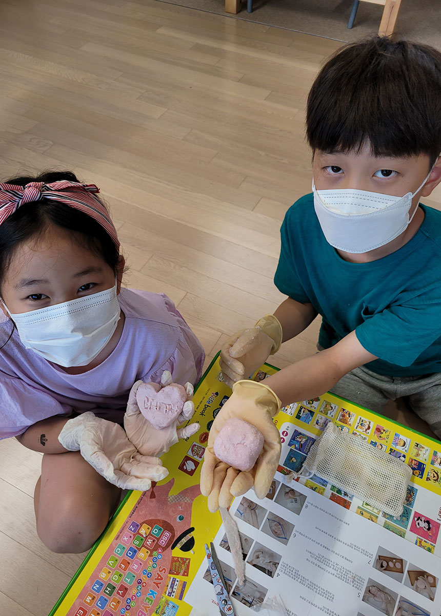평소에도 아이들과 함께 비누를 만들어 사용합니다. 기존 비누는 딱딱한 베이스를 냄비에 녹여야 해서 늘 아이들 안전이 걱정됐어요. 이번에 체험한 비누 만들기는 가루를 반죽해 만드는 방식이라 위험하지 않았고, 아이들이 찰흙 놀이하는 것처럼 재미있게 만들 수 있었습니다. 7살, 5살 어린아이들이라 완성된 모양은 삐뚤빼뚤하지만 예뻐 보이는 건 아들 바보 아빠라 그런 것이겠죠? ^^