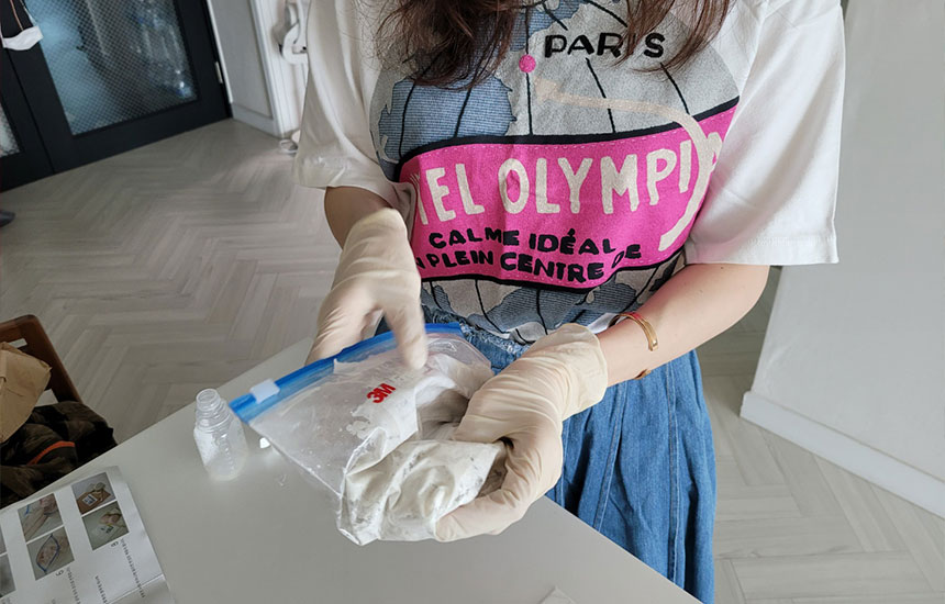 6. 향료를 5에 섞고 지퍼백을 닫은 뒤 주물러 섞고 단단해지면 3~4분간 그대로 둔다.