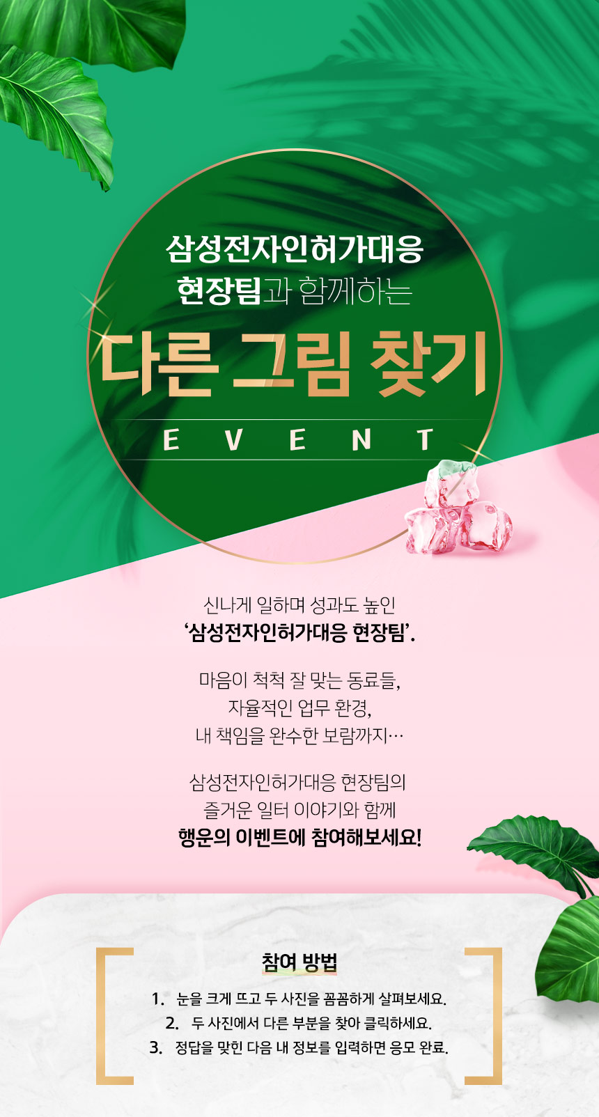 삼성전자인허가대응 현장팀과 함께하는다른 그림 찾기 이벤트 축하드립니다 정답입니다. 이름 전자우편 휴대전화 응모하기 개인정보 수집에 동의합니다. 개인정보는 이벤트 당첨자 확인 및 배송 정보 등으로만 사용되며 본 이벤트 외에 다른 용도로 사용되지 않습니다. [이벤트 서비스를 위한 개인정보 수집 및 이용] 서비스 제공을 위하여 이용자의 개인정보를 아래와 같이 수집하고 있습니다. 고객의 정보는 이벤트 서비스에 참여하기 위한 필수정보로서 제공을 원하지 않을 경우 수집하지 않으며, 동의 거부 시 이벤트 참여에 제한을 받을 수 있습니다. 1. 수집 · 이용 목적 - 이벤트 혜택을 제공하기 위한 정보 전달 - 이벤트 혜택 이용에 따른 본인확인, 고지사항 전달 - 접속 빈도 파악 또는 회원의 서비스 이용에 대한 통계 2. 수집 필수 항목 - 이름, 연락처, 이메일 3. 개인정보 보유 및 이용기간 - 이벤트 종료 후 1년까지 (단, 관계 법령에 따라 필요한 경우 해당 법률에서 정한 기간까지) 4. 이용 제한 대상 - 만 14세 미만은 법적 보호자의 동의가 필요합니다. ※ 고객님께서 개인정보의 수집/이용에 동의하지 않을 권리가 있으며, 미동의 시 서비스를 이용하실 수 없습니다. 공감1 7 Comments 가로등 색상, 맨 오른쪽 분 바지 색상, 왼쪽에서 세번째 분 안전모 색상이 변경되었네요! “삼성전자인허가대응 현장팀” 화이팅 입니다. !!!! 더운 날, 코로나까지 들끓고 있는 지금, 고생하시는 모든 분들에게 힘내라는 말만 할 수 있는 현실이 힘드네요… 그래도 힘내세요. 좋은날이 올거라 생각합니다. 삼성전자인허가 대응현장팀 화이팅… 복잡한 현장 마무리 하시느라 고생하셨읍니다. 가로등 보라색으로 / 맨 오른쪽 분 청바지→황토색 /왼쪽에서 세번째 분 안전모 색상이 변경 1. 가로등 색깔 2. 맨 오른쪽 분 바지 색깔 3. 3번째 분 모자색깔 가로등 색깔, 안전모 색깔, 맨 오른쪽분 바지 색깔 달라요! 무더위에 코로나헤 현장에서 고생하시는 한라인 여러분 화이팅입니다. 댓글 등록 Cancel reply 이름은 전체공개되며, 닉네임으로 설정 가능합니다. 이메일은 공개되지 않습니다. 이미지 업로드는 10 MB까지 가능합니다.