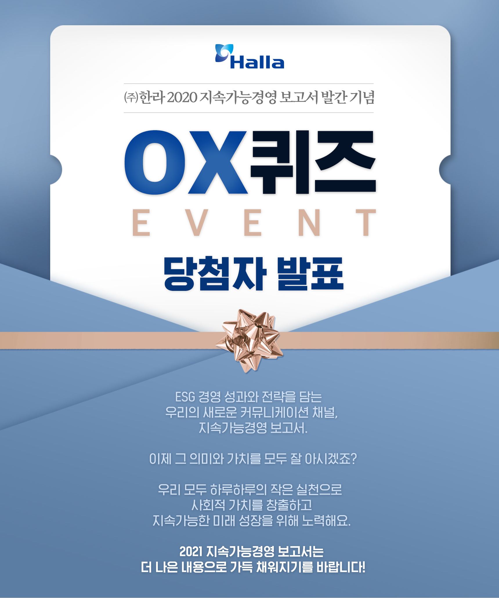 ㈜한라 2020 지속가능경영 보고서 발간 기념 OX 퀴즈 이벤트 당첨자 발표 공감2 등록된 댓글이 없습니다. 댓글 등록 Cancel reply 이름은 전체공개되며, 닉네임으로 설정 가능합니다. 이메일은 공개되지 않습니다. 이미지 업로드는 10 MB까지 가능합니다.