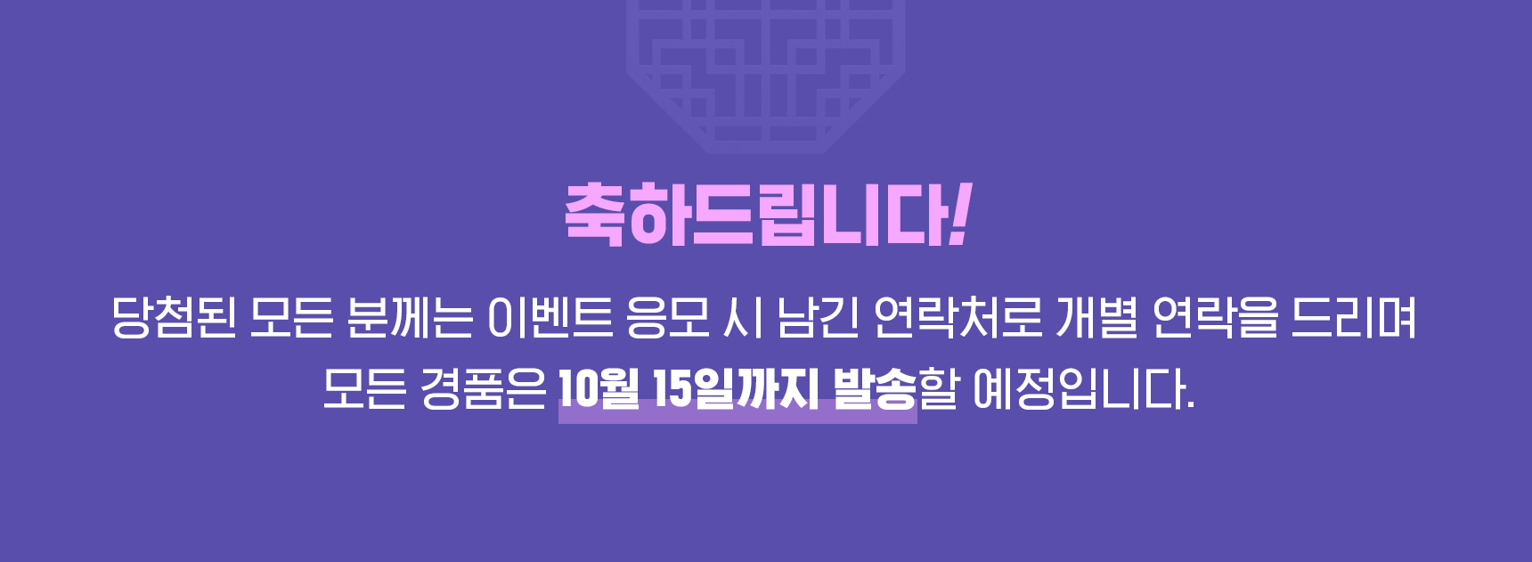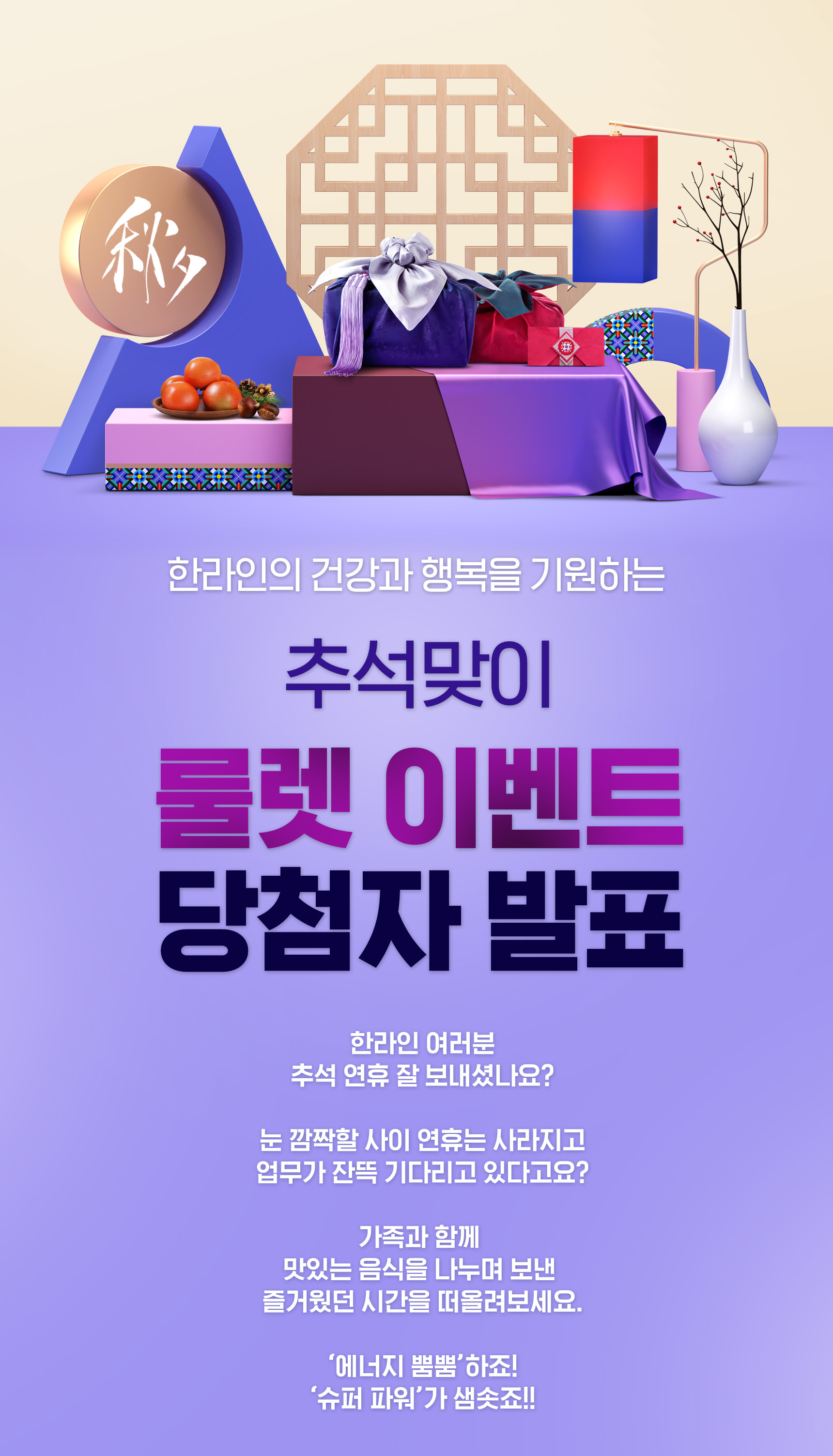 한라인의 건강과 행복을 기원하는 추석맞이 행운의 룰렛 이벤트 당첨자 발표 공감1 등록된 댓글이 없습니다. 댓글 등록 Cancel reply 이름은 전체공개되며, 닉네임으로 설정 가능합니다. 이메일은 공개되지 않습니다. 이미지 업로드는 10 MB까지 가능합니다.