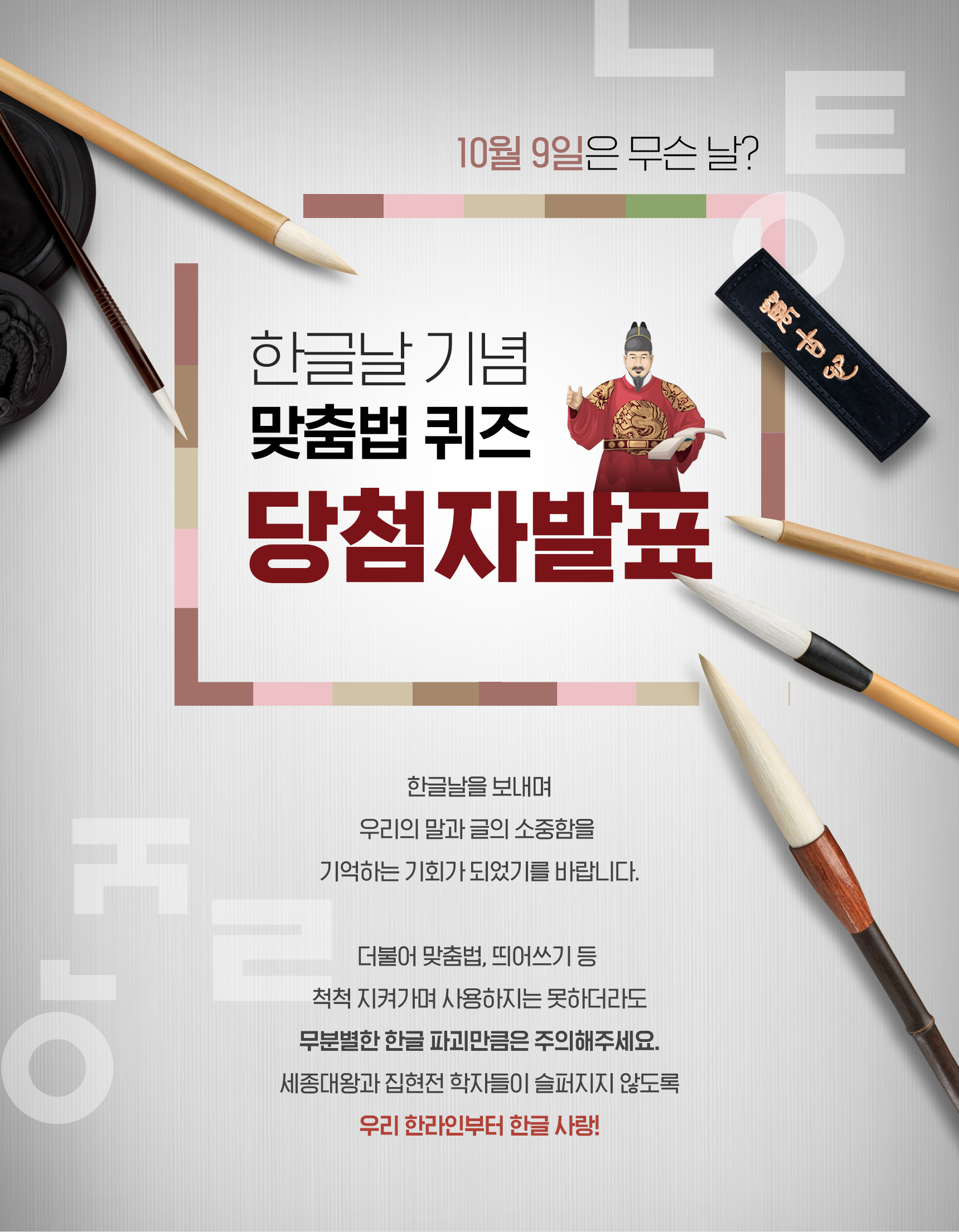 10월 9일은 무슨 날?한글날 기념 맞춤법 퀴즈 당첨자 발표 공감1 등록된 댓글이 없습니다. 댓글 등록 Cancel reply 이름은 전체공개되며, 닉네임으로 설정 가능합니다. 이메일은 공개되지 않습니다. 이미지 업로드는 10 MB까지 가능합니다.
